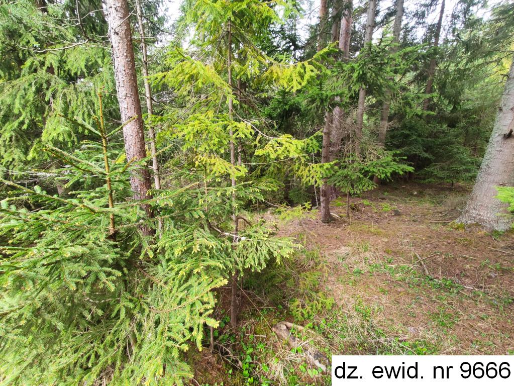 Działka ewidencyjna nr 9666 o powierzchni 0,0351 ha, zgodnie z danymi ewidencji gruntów i budynków użytkowana jest jako las klasy IV. Działka posiada kształt czworoboku – długość ok. 42 m – 49 m, szerokość ok. 8,5 m. Teren działki lekko nachylony jest w kierunku zachodnim. Działka stanowi las, w którym dominującym gatunkiem jest świerk w wieku ok. 65 lat (60%), w wieku ok. 50 lat (20%) oraz w wieku ok. 75 lat (20%). Ponadto występuje miejscowo jodła w wieku ok. 85 lat i 65 lat oraz świerk w wieku ok. 35 lat. Zadrzewienie na poziomie 0,6, bonitacja II klasy. Dane o drzewostanie pozyskano z portalu internetowego https://www.bdl.lasy.gov.pl/portal/mapy#. Bezpośrednie otoczenie działki stanowi las. Brak prawnie uregulowanego dojazdu do działki. Dojazd fizyczny obywa się drogami leśnymi.