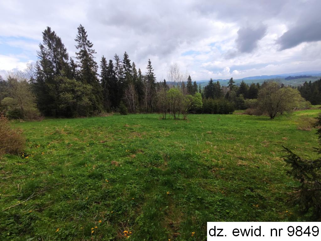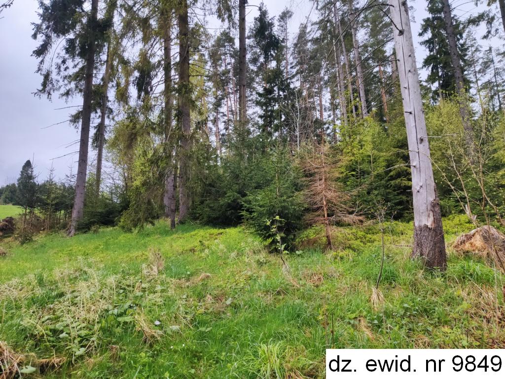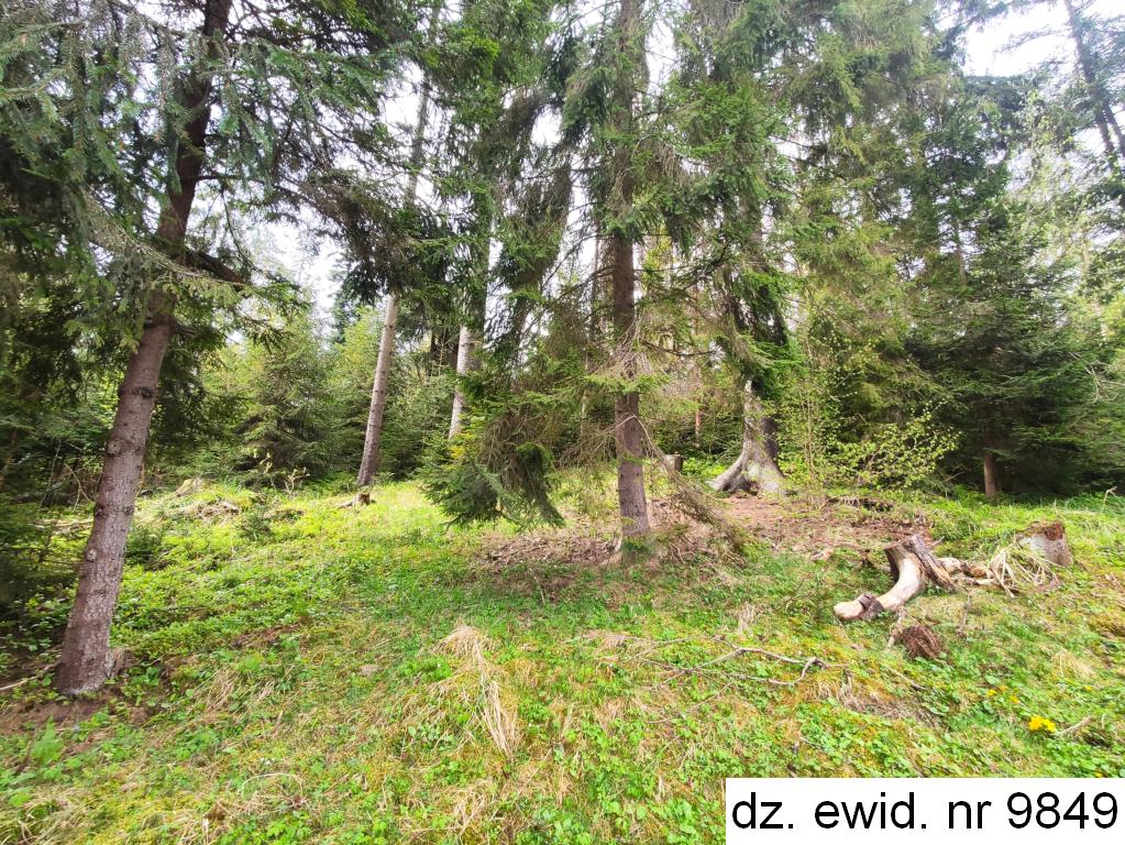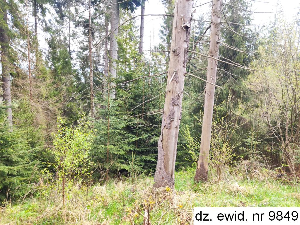 Działka ewidencyjna nr 9849 o powierzchni 0,0219 ha zgodnie z danymi ewidencji gruntów i budynków użytkowana jest jako las klasy IV. Działka posiada kształt czworoboku – długość ok. 56,5 m, szerokość ok. 3,5 m. Teren działki nachylony jest w kierunku północno-wschodnim. Działka stanowi las, w którym dominującym gatunkiem jest świerk w wieku ok. 65 lat (60%), w wieku ok. 55 lat (20%), w wieku ok. 75 lat (10%) i w wieku ok. 40 lat (10%). Ponadto pojedynczo występuje osika w wieku 55 lat, wierzba w wieku 55 lat i sosna w wieku 45 lat. Zadrzewienie na poziomie 0,6, bonitacja II klasy. Dane o drzewostanie pozyskano z portalu internetowego https://www.bdl.lasy.gov.pl/portal/mapy#. Bezpośrednie otoczenie działki stanowią tereny leśne. Brak prawnie uregulowanego dojazdu do działki. Dojazd fizyczny obywa się drogami leśnymi.