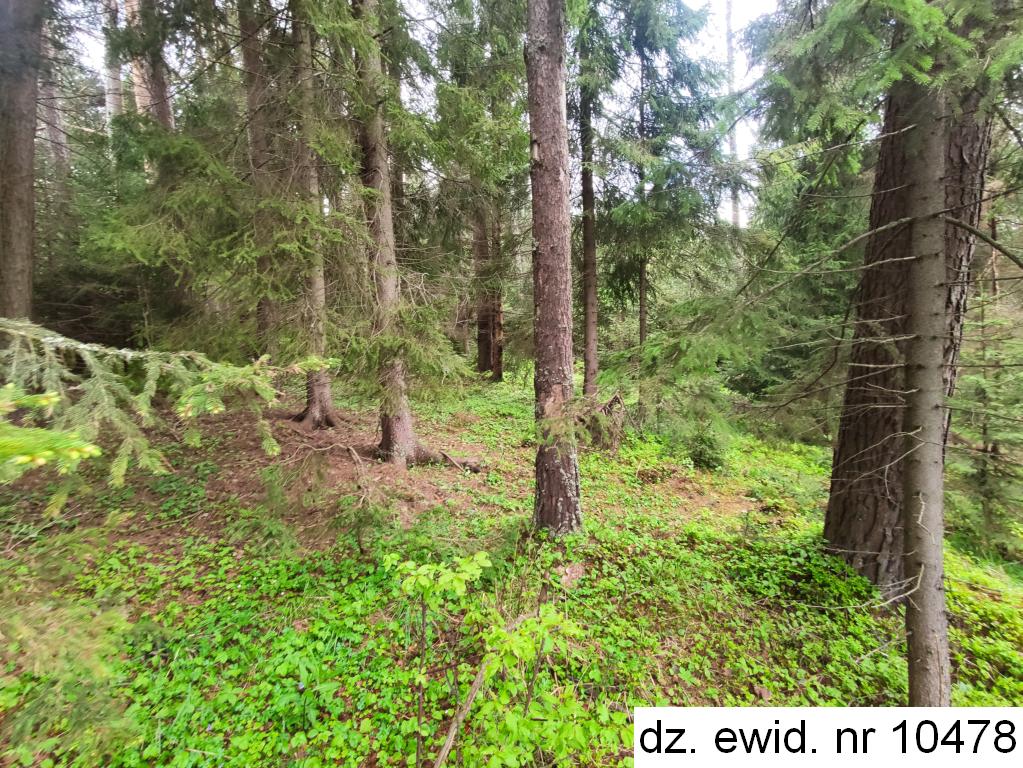 Działka ewidencyjna nr 10478 o powierzchni 0,0363 ha zgodnie z danymi ewidencji gruntów i budynków użytkowana jest jako las klasy III. Działka posiada kształt czworoboku – długość ok. 80 m, szerokość ok. 4,5 m. Teren działki nachylony jest w kierunku północno-zachodnim. Działka stanowi las, w którym dominującym gatunkiem jest świerk w wieku ok. 65 lat (40%), w wieku ok. 50 lat (20%), w wieku ok. 40 lat (20%) oraz w wieku ok. 75 lat (10%). Ponadto występuje jodła w wieku ok. 85 lat (10%), w wieku ok. 105 lat (miejscowo), w wieku ok. 65 lat (miejscowo) i w wieku ok. 50 lat (pojedynczo). Zadrzewienie na poziomie 0,7, bonitacja II klasy. Dane o drzewostanie pozyskano z portalu internetowego https://www.bdl.lasy.gov.pl/portal/mapy#. Bezpośrednie otoczenie działki stanowi las. Brak prawnie uregulowanego dojazdu do działki. Dojazd fizyczny obywa się drogami leśnymi.