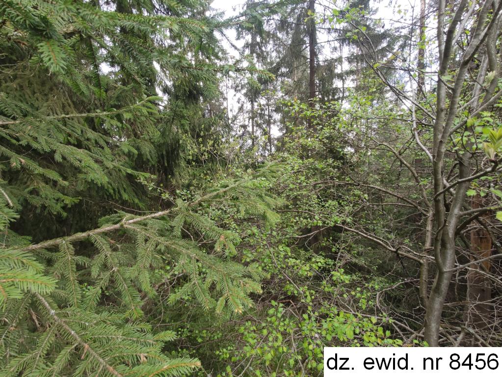 Działka ewidencyjna nr 8456 o powierzchni 0,0135 ha zgodnie z danymi ewidencji gruntów i budynków użytkowana jest jako las klasy V. Działka posiada kształt zbliżony do trójkąta. Teren działki stanowi skarpę schodzącą do cieku wodnego w kierunku północnym. Działka jest zadrzewiona, głównie występuje świerk. Bezpośrednie otoczenie działki stanowi ciek wodny, las oraz tereny rolne. Działka nieuzbrojona. Brak prawnie uregulowanego dojazdu do działki.
